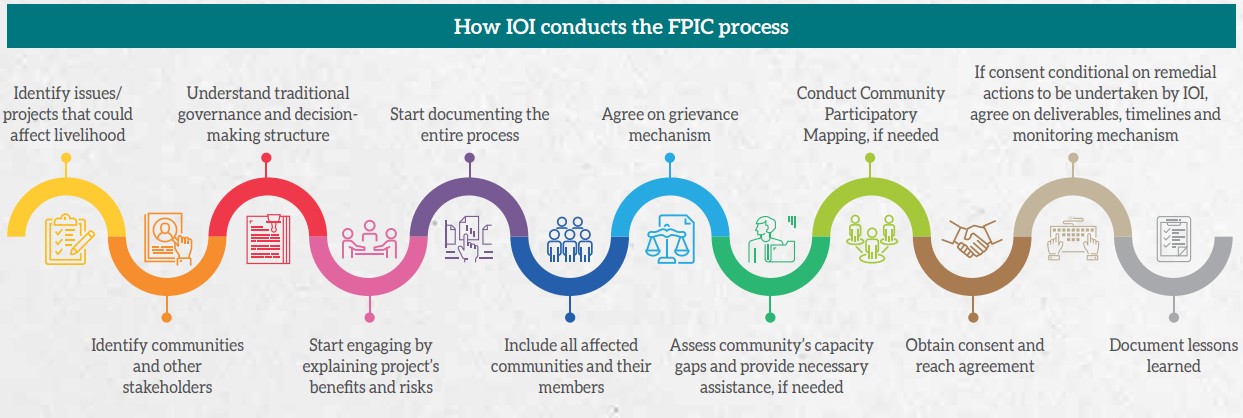 IOI also adheres to the Free, Prior and Informed Consent (“FPIC”) principle in support of UNDRIP to ensure the indigenous communities’ rights are protected. IOI’s FPIC process is as follows: